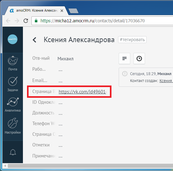 Контакт тут же сохранится в amoCRM – с заполненным полем